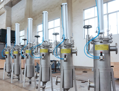 The air cylinder drives the scraper to move up and down to clean the filter element. When the scraper moves down, the impurities are pushed to the bottom of the filter by the scraper, and the large proportion impurities precipitate to the sump. When the scraper moves upward, the residual impurities are scraped and pushed to the upper end of the filter element. The impurities are washed away by the flowing liquid. Through the scraper, they return to the inner surface of the filter element. When the scraper moves downward, they are scraped away. Each cleaning consists of several strokes. After the surface of the filter element is cleaned, the filtering capacity is restored. During cleaning, the filter is normal and the flow is not interrupted.